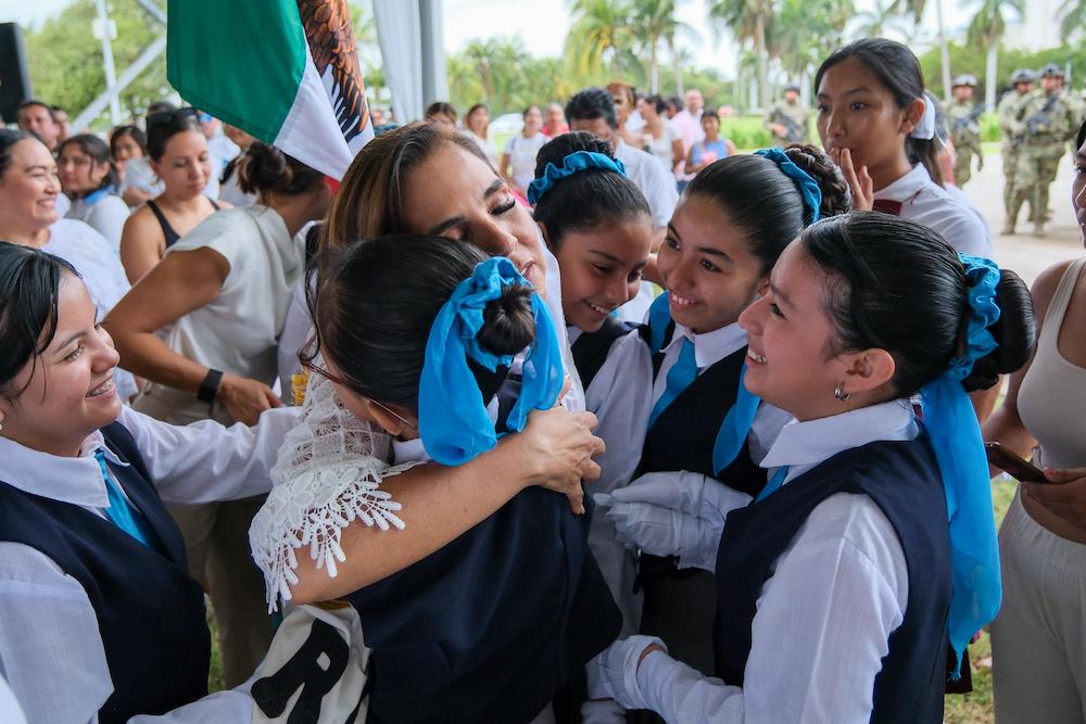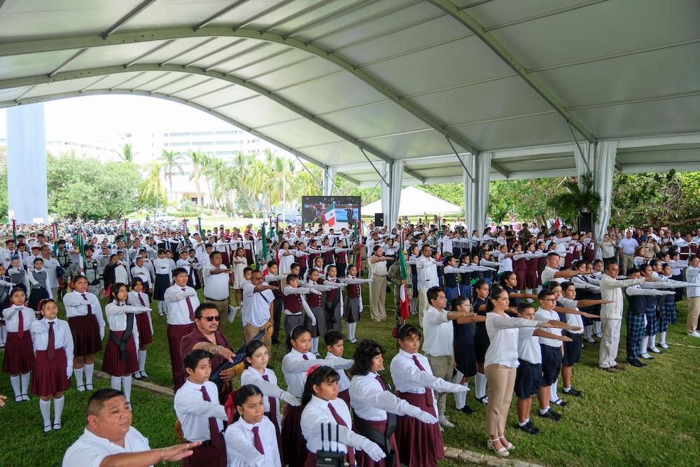 -Desde el asta monumental de la zona hotelera de Cancún, la gobernadora de Quintana Roo entregó el lábaro patrio a escuelas primarias y secundarias, tanto públicas como privadas