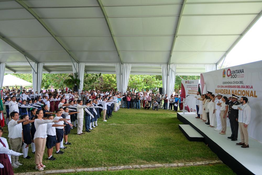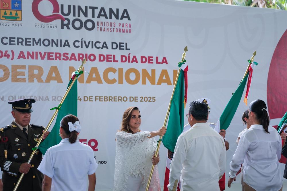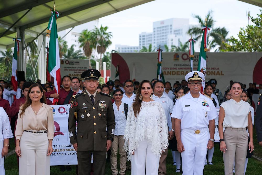 Previamente, la gobernadora de Quintana Roo izó la bandera monumental acompañada de la presidenta honoraria del Sistema DIF Quintana Roo, Verónica Lezama Espinosa; del General de Brigada de Estado Mayor, Fidel Mondragón Rivero, comandante de la 34ª Zona Militar; del Almirante AN. PAH. DEM Guadalupe Juan José Bernal Méndez, comandante de la 5ª Región Naval; del magistrado Heyden Cebada Rivas, presidente del Tribunal Superior de Justicia, de la presidenta municipal Ana Paty Peralta de la Peña; de la secretaria de Educación, Elda Xix Euán; del Comisario General Brigadier DEM José Luis Martínez Rojas, comandante de la 10ª Brigada de la Policía Militar y Coordinador Estatal de la Guardia Nacional, así como el diputado Eric Arcila Arjona.