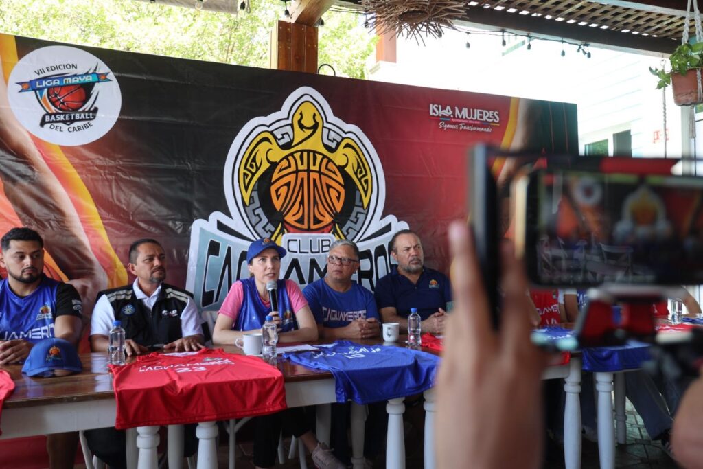 Isla Mujeres, Quintana Roo.– La Presidenta Municipal de Isla Mujeres, Atenea Gómez Ricalde, participó en la conferencia de prensa donde se presentó oficialmente la Séptima Edición de la Liga Maya Caribe, una temporada especial que también conmemora el 40 aniversario de Caguameros de Isla Mujeres, equipo emblemático del deporte local.