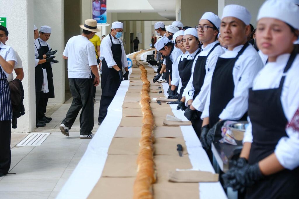 Cancún.- En el marco de la celebración del 25 aniversario de la creación de la Universidad del Caribe (UNICARIBE) Cancún, las y los alumnos de la carrera de Gastronomía prepararon la torta de cochinita más larga, de 300 metros, con el que esperan romper el récord Guinness.