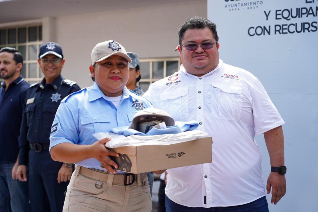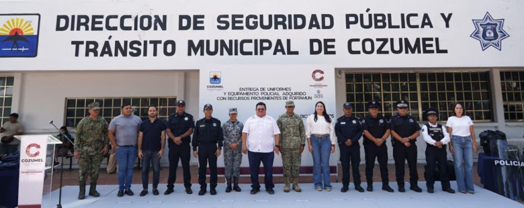 En cumplimiento al compromiso asumido para mejorar las condiciones laborales y dignificar al cuerpo policial, el presidente municipal, José Luis Chacón Méndez, realizó la entrega de uniformes y equipamiento policial adquiridos con recursos provenientes del FORTAMUN (Fondo de Aportaciones para el Fortalecimiento de los Municipios y de las Demarcaciones Territoriales del Distrito Federal), como parte de las acciones permanentes para fortalecer la seguridad en la isla.