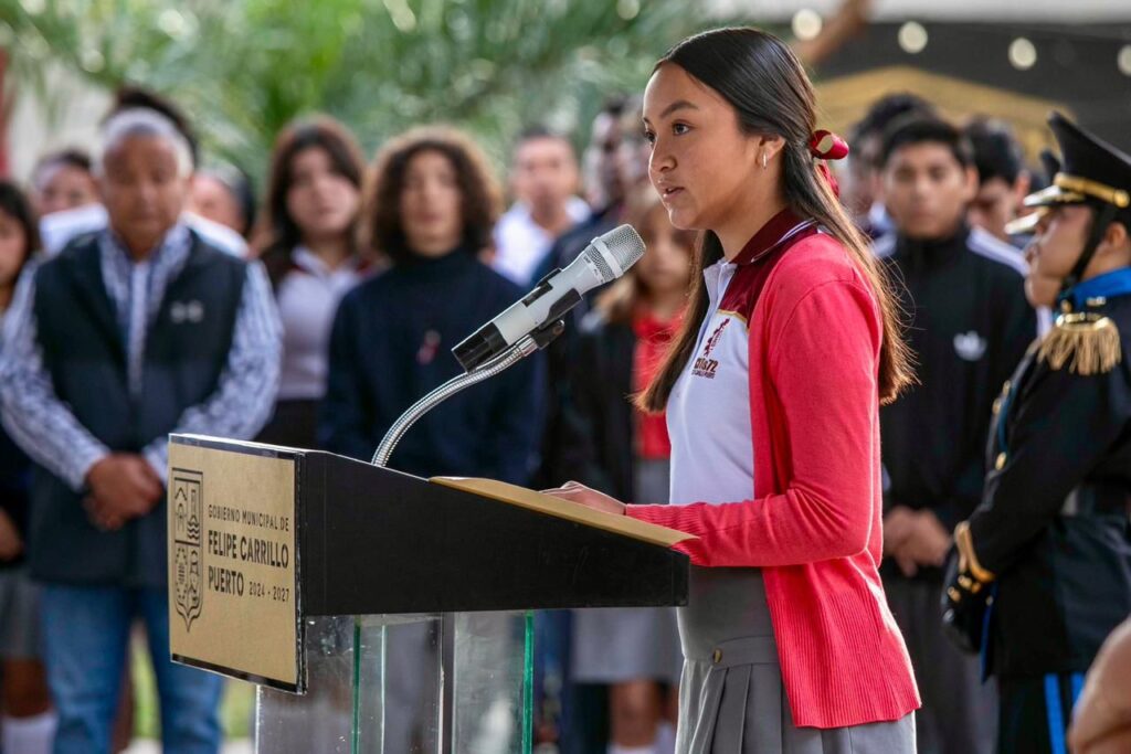La estudiante Neyli Alejandra Caamal Tun, en su calidad de oradora oficial del evento dio lectura a un esbozo histórico de este acontecimiento, destacando los cambios que ha tenido el pendón tricolor a lo largo de la historia.