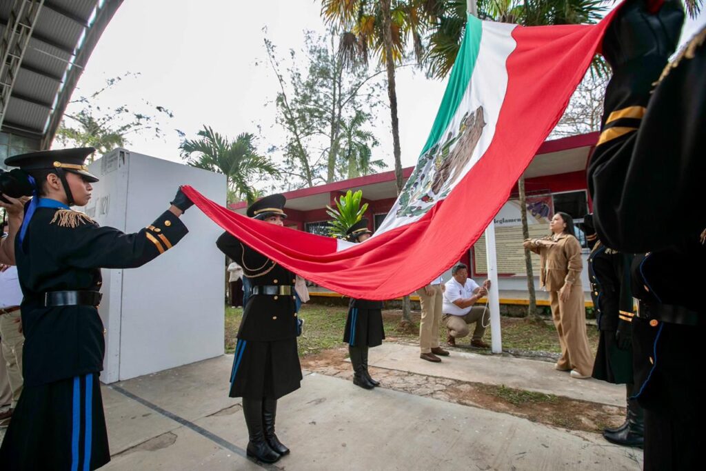 Martes 24 de febrero del 2026.- La presidenta municipal Mary Hernández encabezó el Homenaje cívico conmemorativo al 205 aniversario de la Bandera Nacional, en la plaza principal del Centro de Bachillerato Tecnológico Industrial y de Servicios (CBTIS 72) de Felipe Carrillo Puerto.