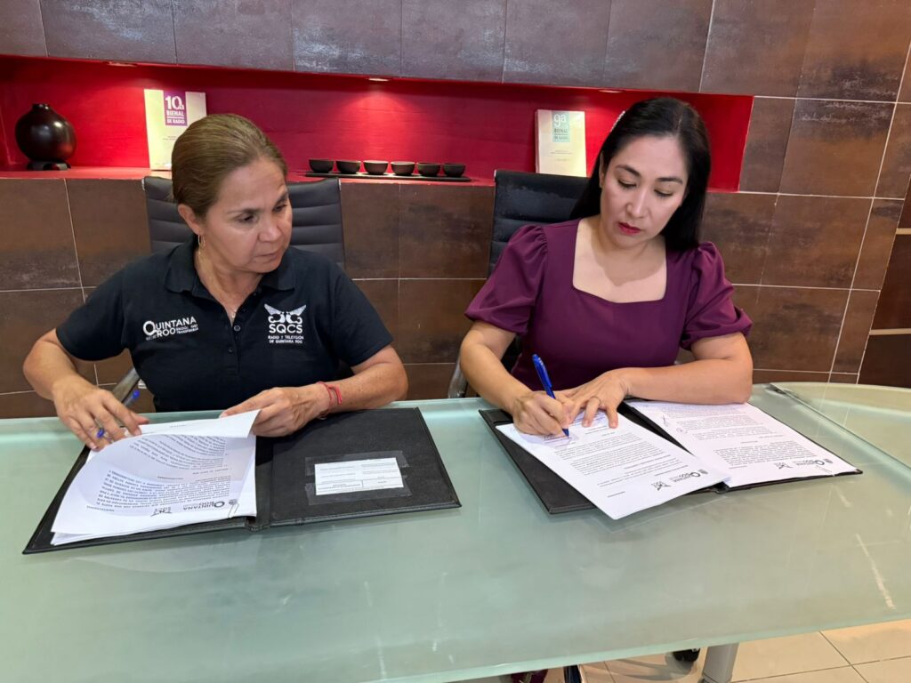 Chetumal.- Con el objetivo de intercambiar y difundir barras de contenido informativo, educación, cultura, deportes, capacitación entre otros, las directoras generales del Sistema Quintanarroense de Comunicación Social Alma Beatriz García Muñoz y de la estación radiofónica “Presumida FM” en el municipio José María Morelos, Lizbeth Gamboa Song, signaron un convenio de colaboración.