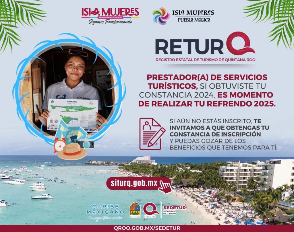 Isla Mujeres, Quintana Roo.- El Gobierno de Isla Mujeres, encabezado por la Presidenta Municipal, Atenea Gómez Ricalde, a través de la Dirección General de Desarrollo Económico y Turismo, invita a las y los prestadores de servicios turísticos, a inscribirse al Curso de Registro Estatal de Turismo de Quintana Roo (RETURQ), el cual permitirá mejorar la calidad y confianza de los servicios turísticos del municipio.