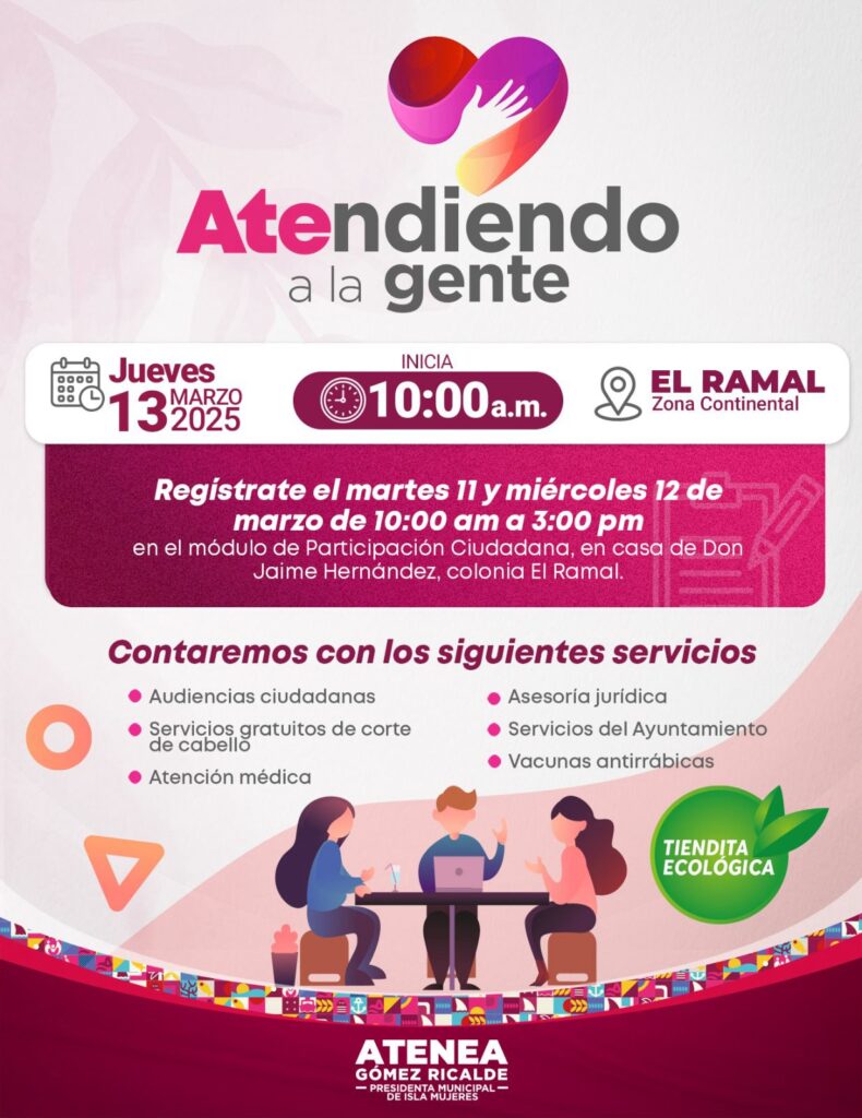 Isla Mujeres, Quintana Roo.- El Ayuntamiento de Isla Mujeres, encabezado por la presidenta municipal Atenea Gómez Ricalde, invita a todas las familias a participar en las audiencias públicas “ATEndiendo a la Gente”, que se llevará a cabo este jueves 13 de marzo a las 10:00 horas en la colonia El Ramal, en Zona Continental del municipio.