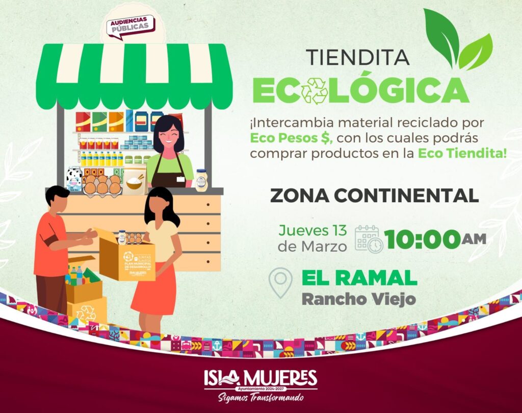 Isla Mujeres, Quintana Roo.- Con el objetivo de fortalecer la cultura del reciclaje y mantener una Isla Mujeres más limpia, bonita y ordenada, el Gobierno Municipal que encabeza la alcaldesa Atenea Gómez Ricalde, invita a la ciudadanía a participar en el programa “Tiendita Ecológica”.