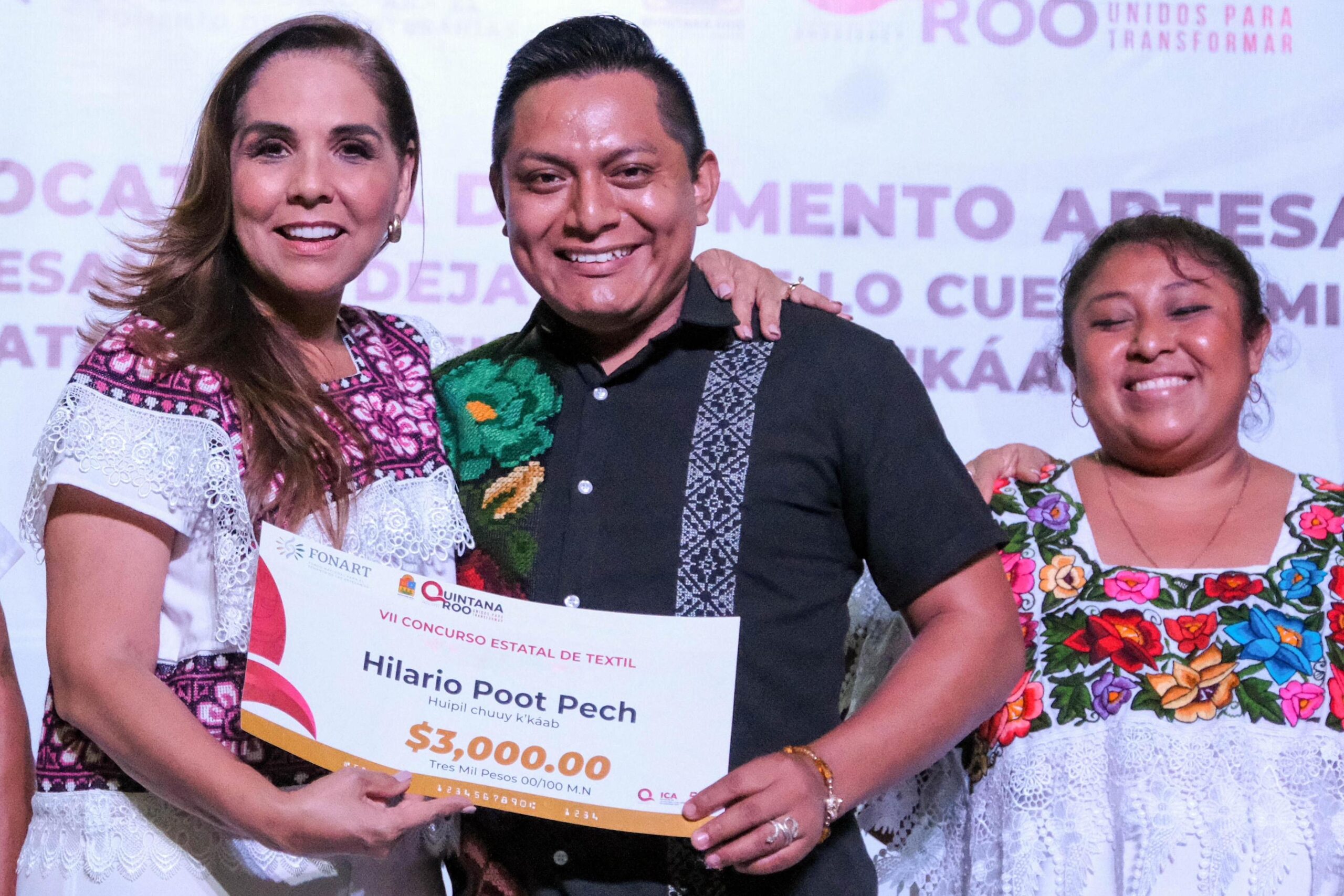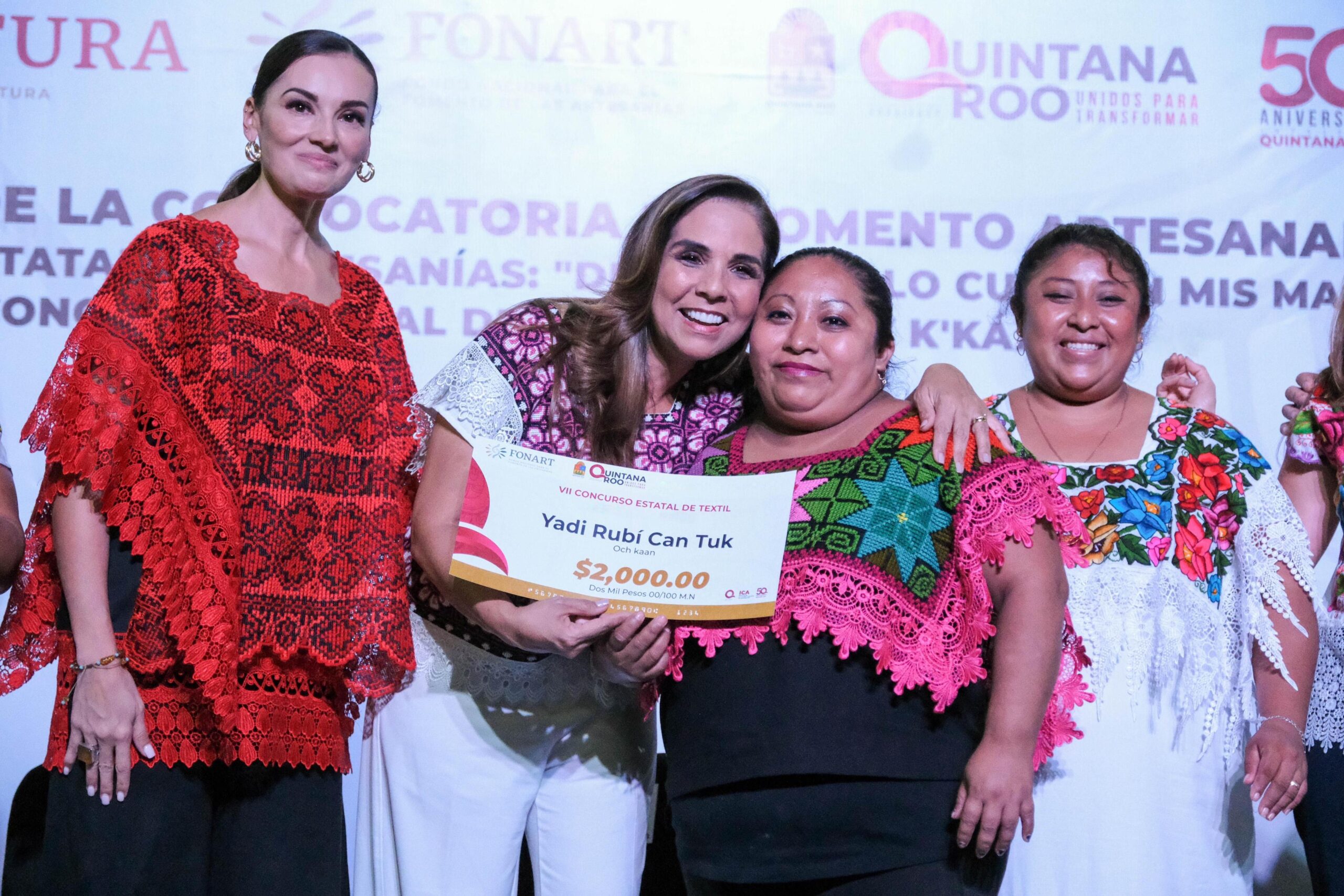 Con el apoyo del Fondo Nacional para el Fomento de las Artesanías (FONART), en coordinación con el Instituto de la Cultura y las Artes, se premió 18 artesanas y 1 artesano de las de las comunidades de Filomeno Mata, Ignacio Manuel Altamirano, Nueva Loría, X-Pichil, X- Hazil Sur, del municipio de Felipe Carrillo Puerto; San Juan de Dios, del municipio de Lázaro Cárdenas; Chan Chen, del municipio de Tulum, y Sacalaca del municipio de José María Morelos, ganadores del VII Concurso Estatal de Textil “Chuuy K’ Kaab”.