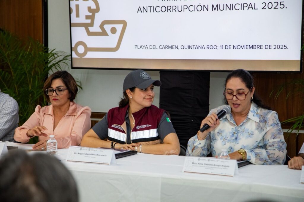 Playa del Carmen, Quintana Roo.— La presidenta municipal Estefanía Mercado, junto con la secretaria técnica de la Secretaría Ejecutiva del Sistema Anticorrupción del Estado de Quintana Roo (Sesaeqroo), Alma Gabriela Arroyo Angulo, firmaron este martes la Estrategia Anticorrupción Municipal 2025, un acto que consolida el compromiso del gobierno municipal con la transparencia, la integridad pública y la rendición de cuentas.