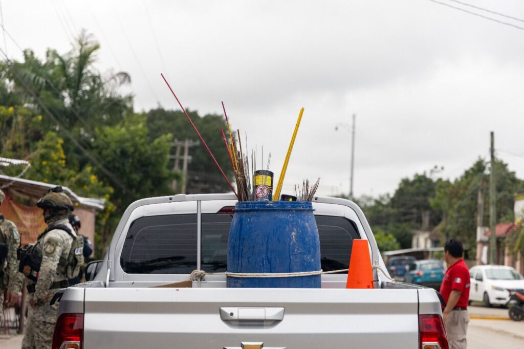 Durante el operativo coordinado por el área de fiscalización del ayuntamiento local, en coordinación con protección civil municipal, SEDENA, SEMAR, Grupo Jaguar, Seguridad ciudadana municipal, se realizó la visita a puntos señalados y reportados como focos rojos en donde se decomisó material explosivo y pirotecnia de distintas denominaciones.